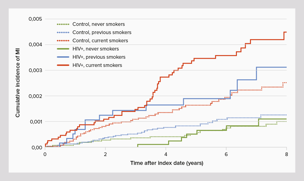 Das Herzinfarktrisiko unterscheidet sich deutlich zwischen rauchenden und nicht rauchenden Personen sowie zwischen Raucher*innen mit oder ohne HIV