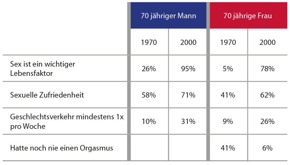 Ein höheres Lebensalter steht dabei der Sexualität nicht im Wege. Viele Menschen können bis ins hohe Alter eine zufriedenstellende gelungene Sexualität erleben, sich verlieben und stark erregt sein. Sehr anschaulich zeigt dies die britische Umfrage „NATSAL“, die seit 1990 alle 10 Jahre durchgeführt wird und Daten von mehreren 10.000 Personen beinhaltet. Hier sieht man, dass 57-jährige Paare 2,5-mal so viel Sex haben, als Singles mit 34 Jahren.